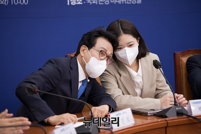 박지현 더불어민주당 비상대책위원장과 안민석 의원이 12일 오전 국회에서 열린 중진의원단 당 혁신방안 소통간담회에서 대화를 나누고 있다. (사진=공동취재단)