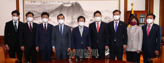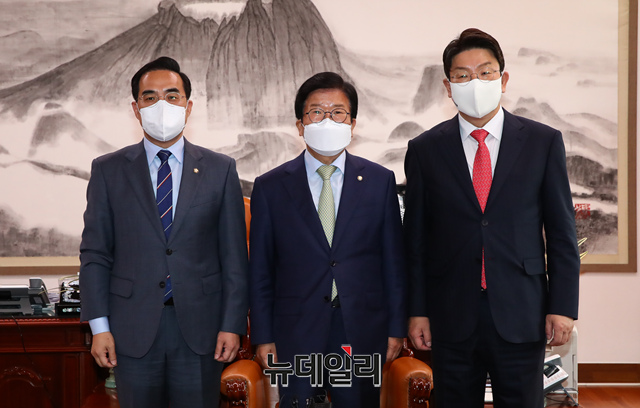 박병석 국회의장과 여야 원내대표가 12일 국회 의장실에서 열린 국회의장 여야 원내대표 회동에 앞서 기념촬영을 하고 있다. (왼쪽부터 더불어민주당 박홍근 원내대표, 박병석 의장, 국민의힘 권성동 원내대표) (사진=공동취재단)