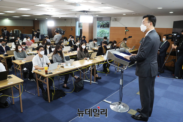 유상범 정무사법행정부과 인수위원이 13일 오전 서울 종로구 제20대 대통령인수위원회 공동기자회견장에서 검수완박(검찰 수사권 완전 박탈)과 관련해 발언을 하고 있다.