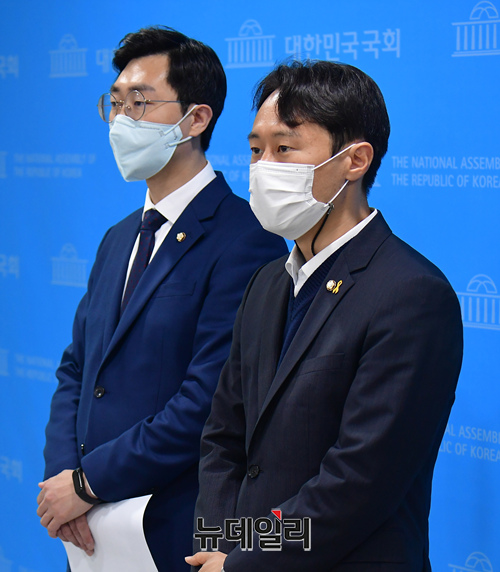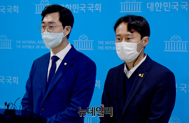 이탄희·장경태 더불어민주당 의원이 13일 오전 국회 소통관에서 가지화견을 갖고 정치개혁특별위원회(정개특위) 위원 사임 기자회견을 마친후 기자들의 질문에 답하고 있다.