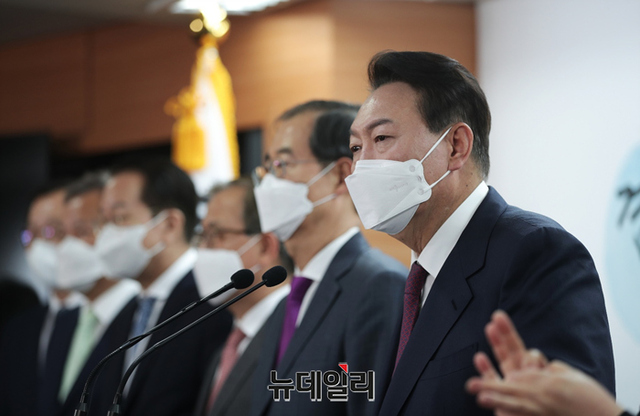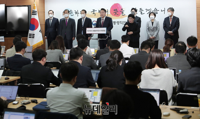 윤석열 대통령 당선인이 13일 오후 서울 종로구 인수위원회에서 국무위원 후보 및 대통령실 비서실장 인선을 발표하고 있다.윤 당선인은 △김인철 전 한국외대 총장(부총리 겸 교육부 장관) △박진 의원(외교부 장관) △권영세 의원(통일부 장관) △한동훈 사법연수원 부원장(법무부 장관) △상민 전 국믹권익위 부위원장(행정안전부 장관) △한화진 한국환경연구원 명예연구위원(환경부 장관) △조승환 전 해양수산과학기술진흥원장(해양수산부 장관) △이용 의원(중소벤처기업부 장관) △김대기 전 청와대 정책실장(대통령 비서실장) 등을 임명했다. (사진=인수위)