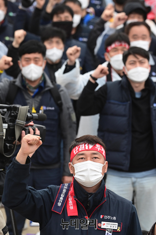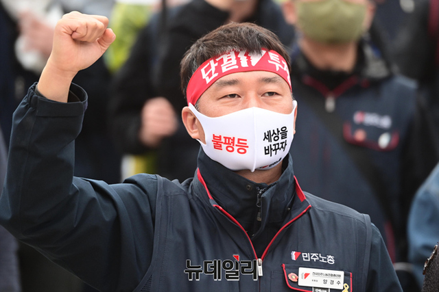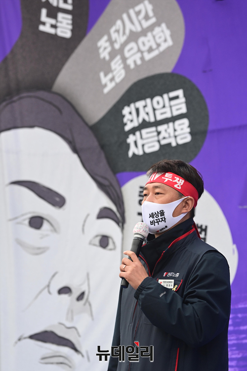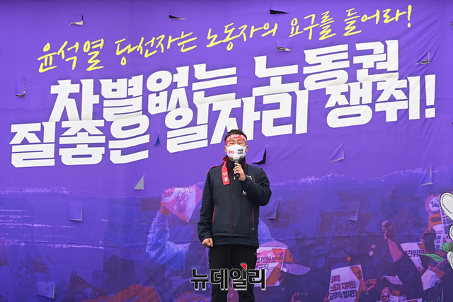 양경수 민노총 위원장이 윤석열 정부 출범을 한 달여 앞둔 13일 오후 서울 종로구 종묘공원에서 결의대회를 갖고 윤 당선인의 노동정책을 비판하는 발언을 하고 있다.