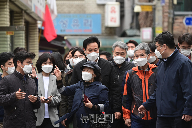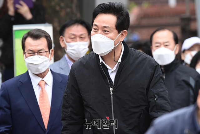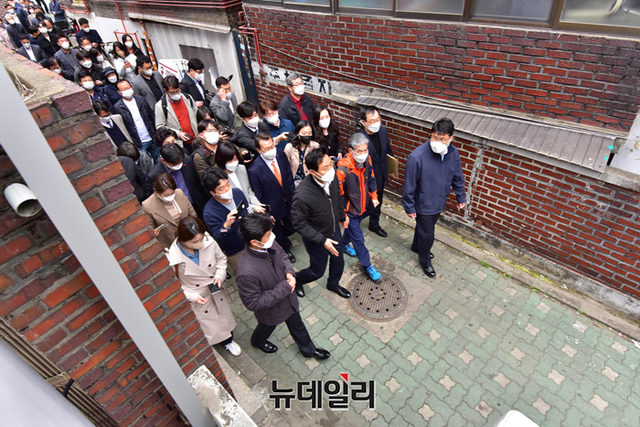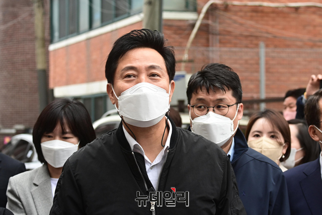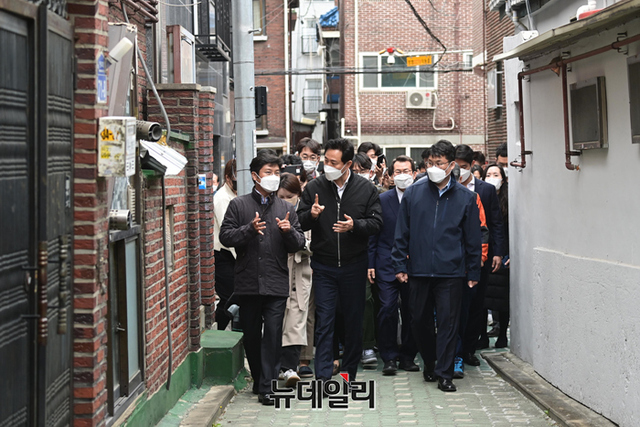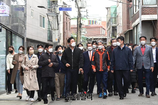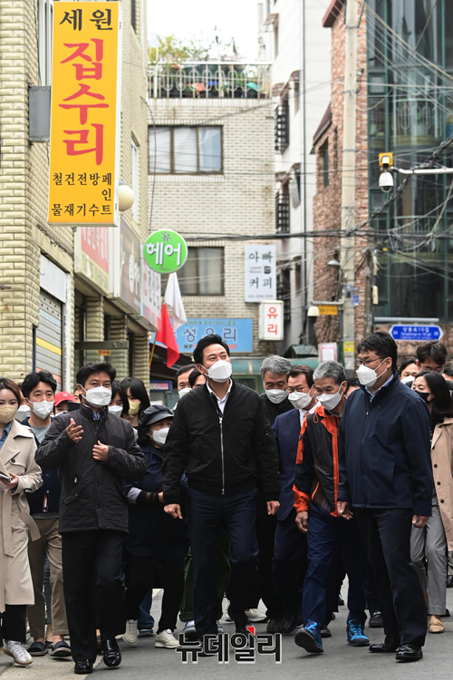 오세훈 서울시장이 14일 오후 서울 중랑구 모아타운 시범사업지를 찾아 현장을 살펴보고 있다.