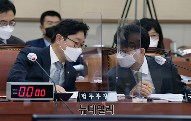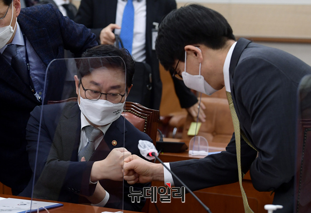 박범계 법무부 장관이 14일 오후 국회에서 열린 법제사법위원회 전체 회의에서 넥타이를 만지고 있다. (사진=공동취재단)