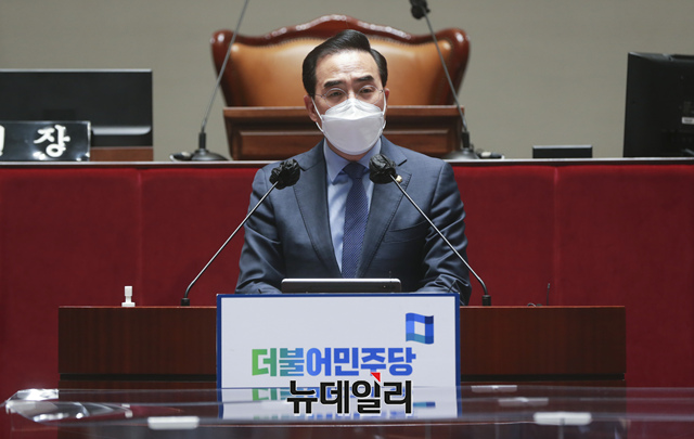 박홍근 더불어민주당 원내대표가 15일 오후 국회에서 열린 의원총회에서 검수완박 (검찰 수사권 완전 박탈) 관련해 발언하고 있다. (사진=공동취재단)