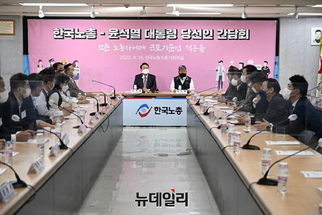 윤석열 대통령 당선인이 15일 오후 한국노총회관 대회의실에서 열린 간담회에서 기념촬영을 하고 있다. (사진=인수위)