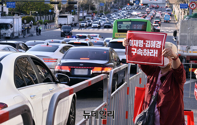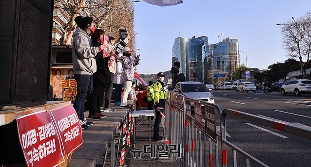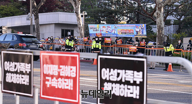 서초동 맞불집회에 참석한 시민들이 16일 오후 서울 서초동 대검찰청 앞에서 '이재명·김혜경 구속하라' '여성가족부 해체하라' 등이 적힌 피켓을 들고 있다.