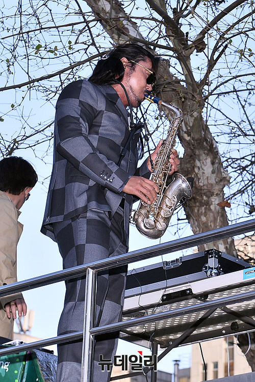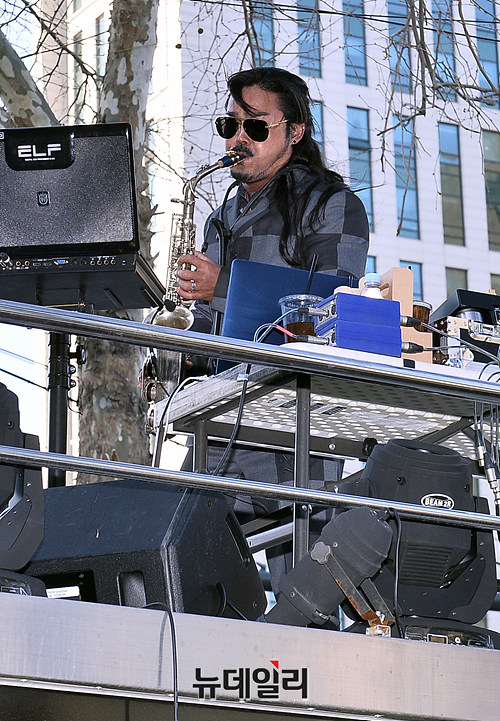 [포토] 서초동 맞불집회서 색소폰 연주하는 안정권