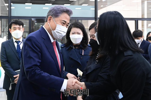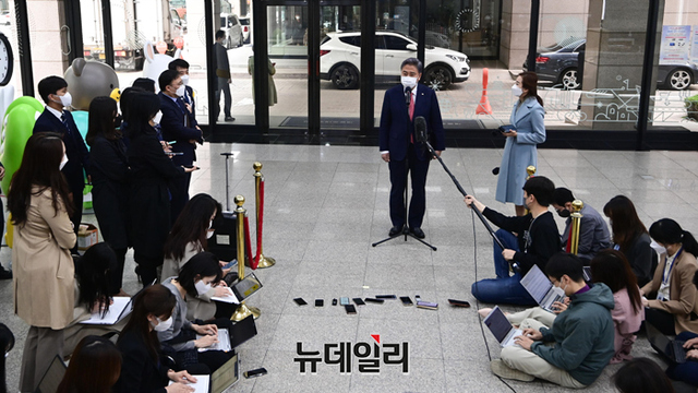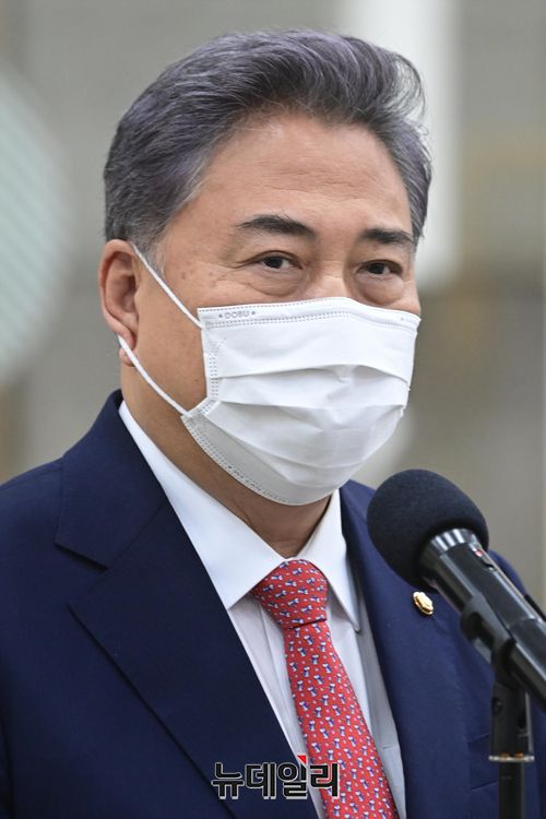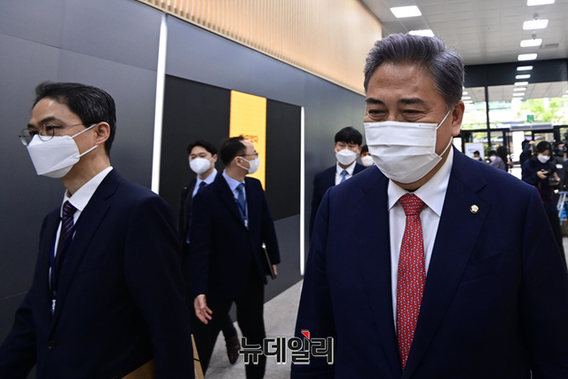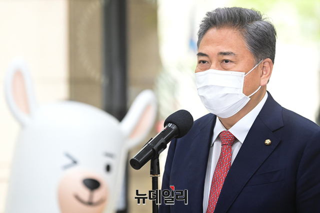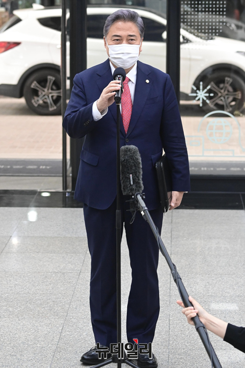 박진 외교부 장관 후보자가 18일 오전 서울 종로구 세종로대우빌딩에 마련된 집무실로 첫 출근하며 소감을 밝히고 있다. 박 후보자는 "지금은 북한에 대한 정책 변화 필요한 시점이다"고 말했다.