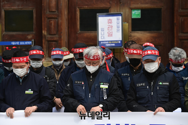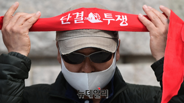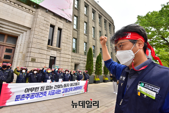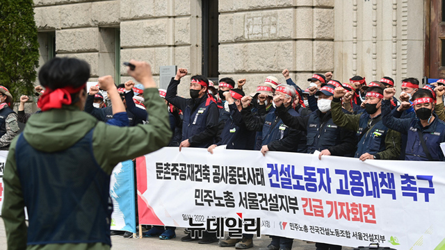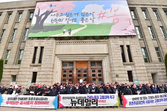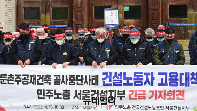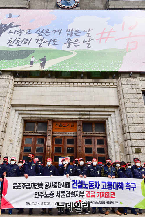민노총 전국건설노동조합이 18일 오전 서울 중구 서울도서관 앞에서 둔촌주공재건축 공사중단 사태과 관련해 건설노동자 고용대책 마련 및 임금 보전을 촉구하는 긴급 기자회견을 하고 있다.