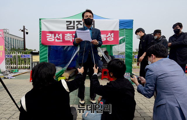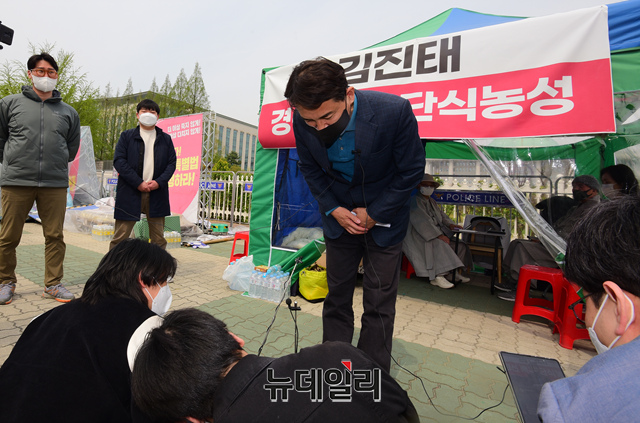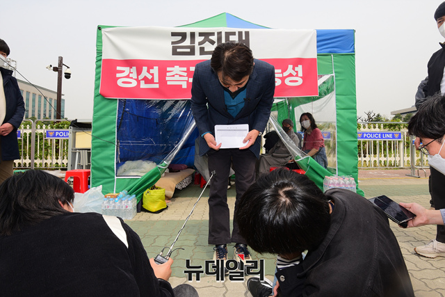 강원도지사 출마 선언을 한 김진태 전 국민의힘 의원이 18일 오전 국회 앞 농성장에서 '5.18 북한 개입설'을 주장한 공청회 개최 논란과 조계종 민노총 관련 공권력 투입 관련 문제 발언 사과 기자회견을 갖고 있다.