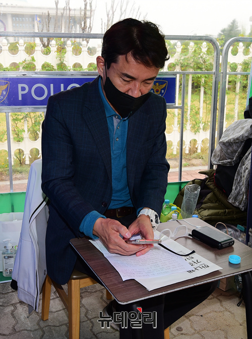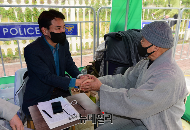 강원도지사 출마 선언을 한 김진태 전 국민의힘 의원이 18일 오전 국회 앞 단식 농성장에서 스님들을 만나고 있다.