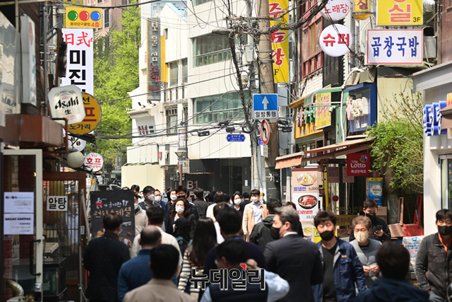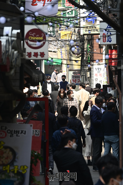 정부가 2년 1개월 만(757일)에 사회적 거리두기를 전면 해제한 18일 오후 서울도심 식당가를 찾은 시민들로 붐비고 있다.