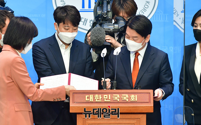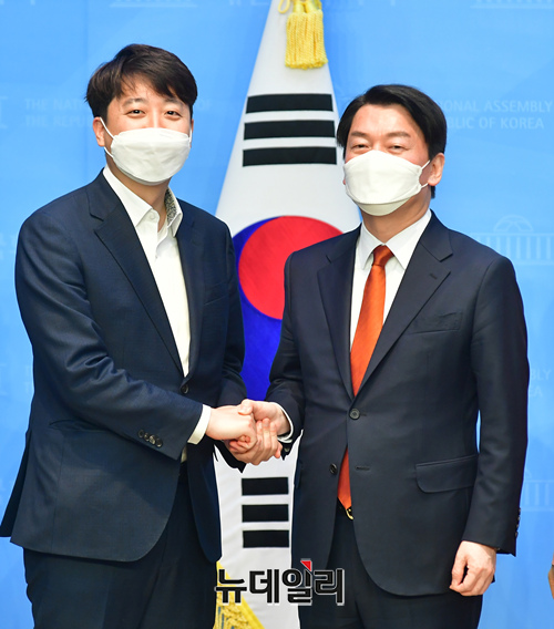 이준석 국민의힘 대표와 안철수 국민의당 대표가 18일 오후 국회 소통관에서 기자회견을 갖고 '합당'을 공식 발표한 후 합의문을 들어 보이고 있다.