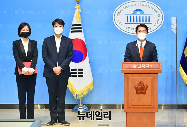 이준석 국민의힘 대표와 안철수 국민의당 대표가 18일 오후 국회 소통관에서 기자회견을 갖고 '합당'을 공식 발표하고 있다.