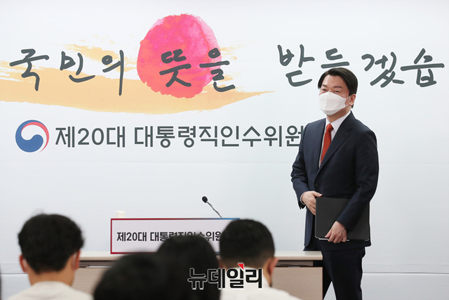 대통령직인수위원회 공식 출범 한 달을 맞은 18일 오전 서울 종로구 인수위 공동기자회견장에서 안철수 인수위 위원장이 기자간담회를 갖고 있다.
