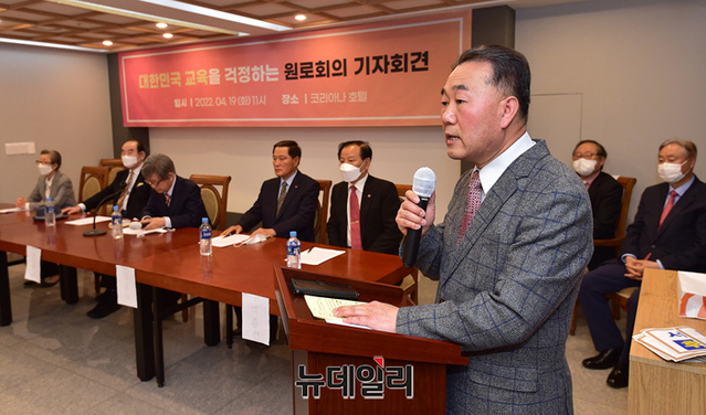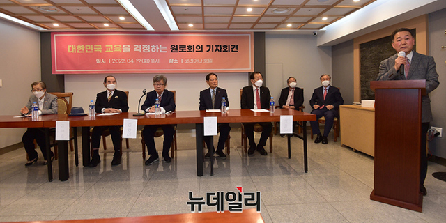 6.1 지방선거 서울시교육감 선거와 관련해 '대한민국 교육을 걱정하는 원로회의'가 19일 오전 서울 중구 코리아나호텔에서 중도·보수 서울교육감 단일화를 촉구하는 기자회견을 갖고 있다.