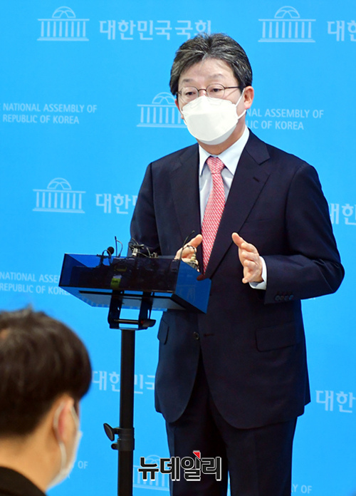유승민 국민의힘 경기도지사 예비후보가 19일 오전 국회 소통관에서 지지호소 기자회견을 마치고 기자들의 질문에 답하고 있다.