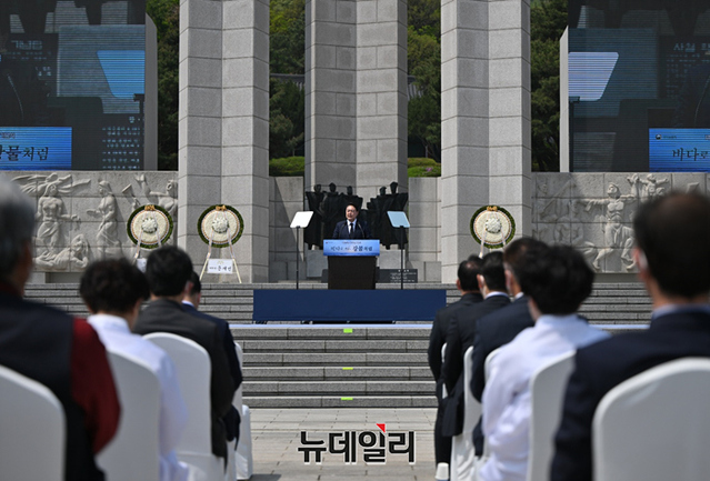 윤석열 대통령 당선인이 19일 서울 강북구 우이동 국립 4·19민주묘지에서 열린 제62주년 4·19혁명 기념식에서 기념사를 하고 있다. (사진=인수위)