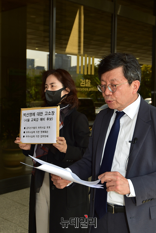 수도권교육감후보단일화협의회(교추협) 박성현, 박소영 운영위원이 20일 오전 서울 서초구 중앙지검으로 중도·보수 서울교육감 단일화 과정에서 박선영 서울교육감 예비후보가 허위사실 유포와 명예훼손을 했다며 고소했다.