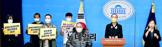 장혜영 정의당 의원이 20일 오전 국회 소통관에서 기자회견을 갖고 장애인활동지원법 개정안 발의 기자회견을 하고 있다.