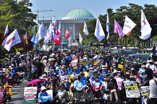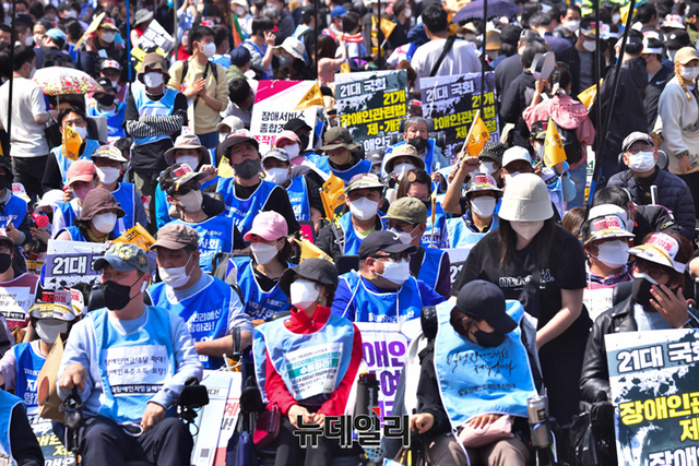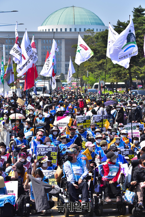 제42회 장애인의 날인 20일 오후 서울 여의도 국회의사당 인근에서 전국장애인차별철폐연대(전장연)가 '장애인 민생 4대 법안'과 '장애인 권리예산 보장' 등의 시행을 촉구하는 대규모 집회를 하고 있다.