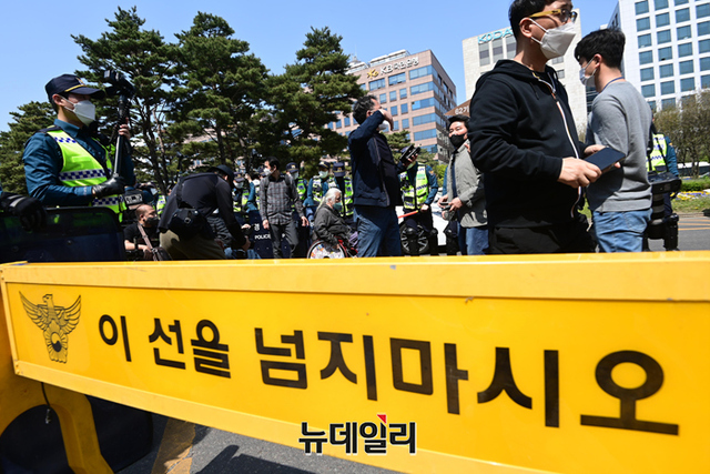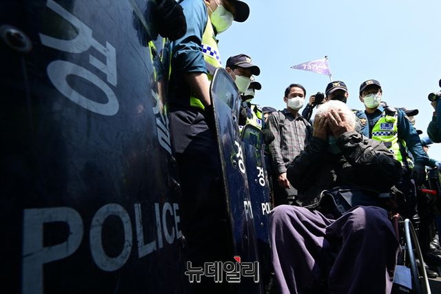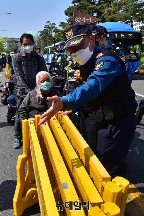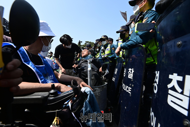 제42회 장애인의 날인 20일 오후 서울 여의도 국회의사당 인근에서 전국장애인차별철폐연대가 '장애인 민생 4대 법안'과 '장애인 권리예산 보장' 등의 시행을 촉구하며 도로를 일부 점거해 경찰과 마찰을 빚고 있다.