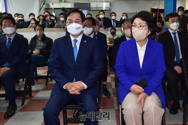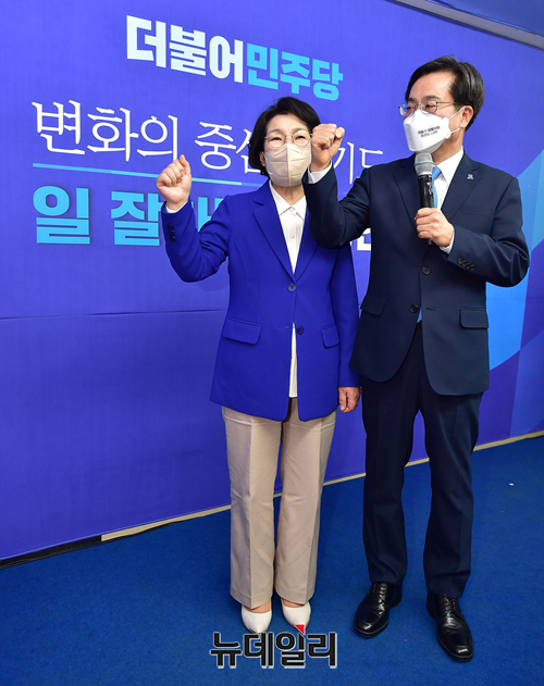 김동연 더불어민주당 경기도지사 예비후보 내외가 20일 오후 경기 수원시 팔달구에서 열린 선거사무소 개소식에서 선거 슬로건을 외치고 있다.(경기 수원=정상윤 기자)