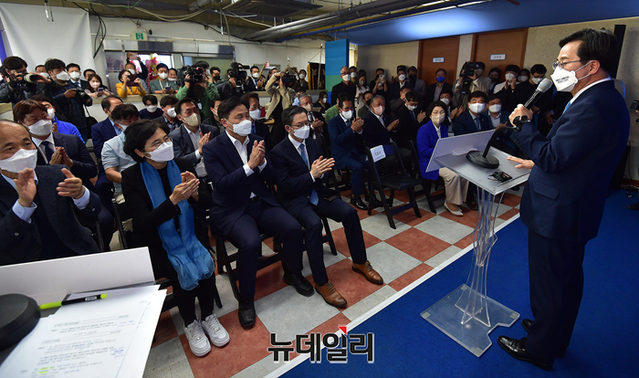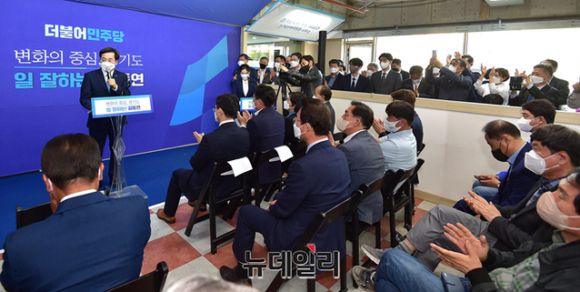 김동연 더불어민주당 경기도지사 예비후보가 20일 오후 경기 수원시 팔달구에서 열린 선거사무소 개소식에서 인사말을 하고 있다. (경기 수원=정상윤 기자)