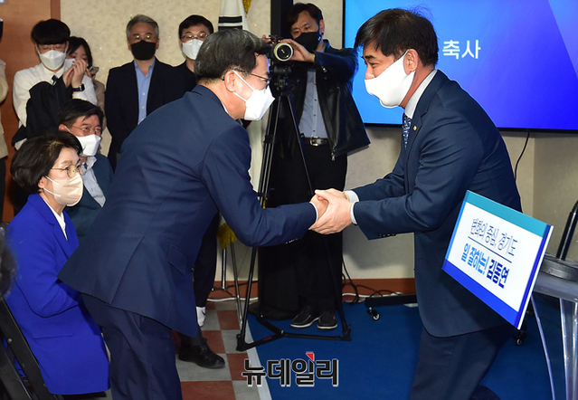 김병욱 더불어민주당 의원이 20일 오후 경기 수원시 팔달구에서 열린 김동연 경기도지사 예비후보 선거사무소 개소식에서 축사를 하고 있다. (경기 수원=정상윤 기자)