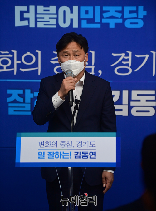 김영진 더불어민주당 의원이 20일 오후 경기 수원시 팔달구에서 열린 김동연 경기도지사 예비후보 선거사무소 개소식에서 축사를 하고 있다. (경기 수원=정상윤 기자)
