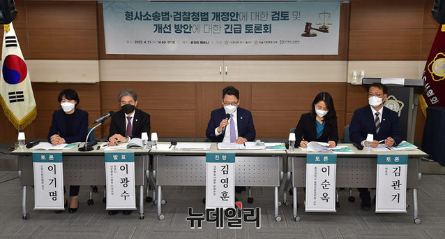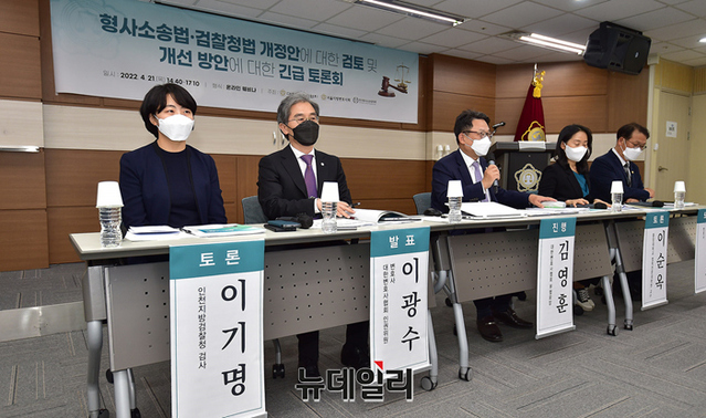 대한변호사협회, 서울지방변호사회, 한국형사소송법학회가 공동으로 추최한 검수완박 관련 긴급토론회가 21일 오후 서울 강남구 대한변호사회관에서 '형사소송법·검찰청법 개정안에 대한 검토 및 개선방안'을 주제로 열렸다.토론회엔 이종엽 대한변협 협회장, 김정욱 서울지방변호사회장, 정웅석 한국형사소송법학회장, 우인식 대한변협 인권이사, 김영훈 대한변협 부협회장 등이 참석했다.주제발표와 지정토론엔 이광수 변호사, 이순옥 중앙대 교수, 이기명 검사, 김관기 변호사, 장영수 고려대 교수, 이호선 국민대 교수, 손정아 검사, 이근우 가천대 교수, 이완규 변호사가 나섰다.