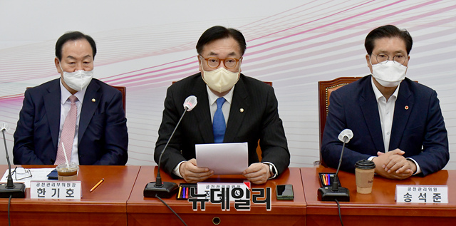 정진석 국민의힘 공천관리위원장이 22일 오전 국회에서 지방선거 공천자를 발표하고 있다. 이날 공관위는 경기 김은혜, 인천 유정복, 울산 김두겸, 경남 박완수 후보를 확정해 발표했다.