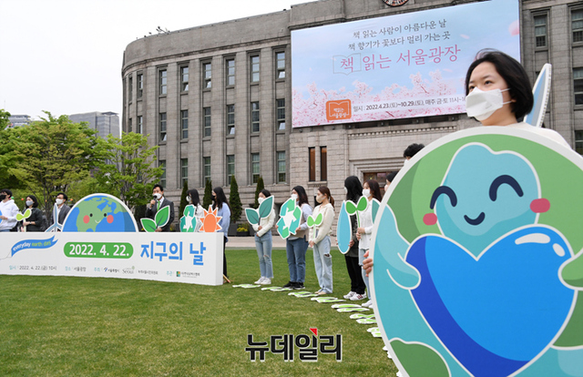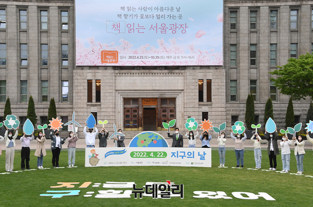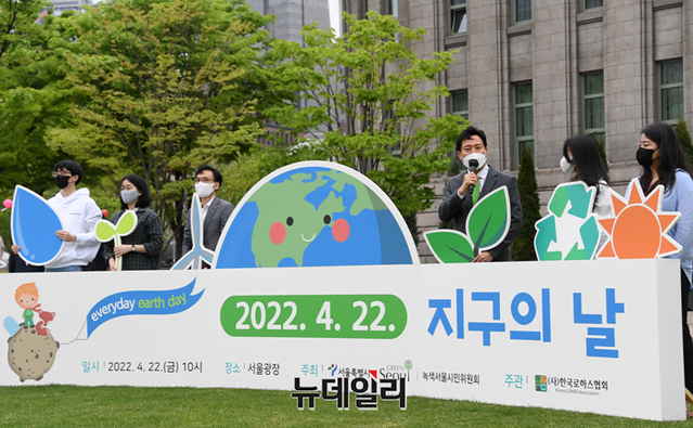 오세훈 서울시장이 22일 오전 서울 중구 서울광장에서 진행된 2022 지구의 날 기념행사에서 참석자들과 기념촬영을 하고 있다. (사진=서울시)
