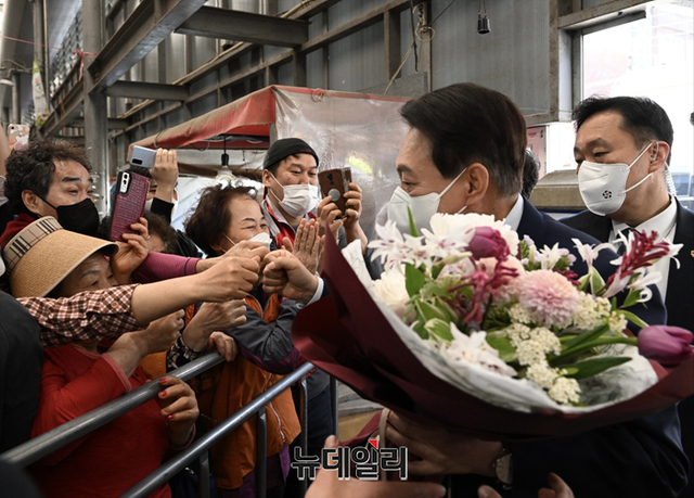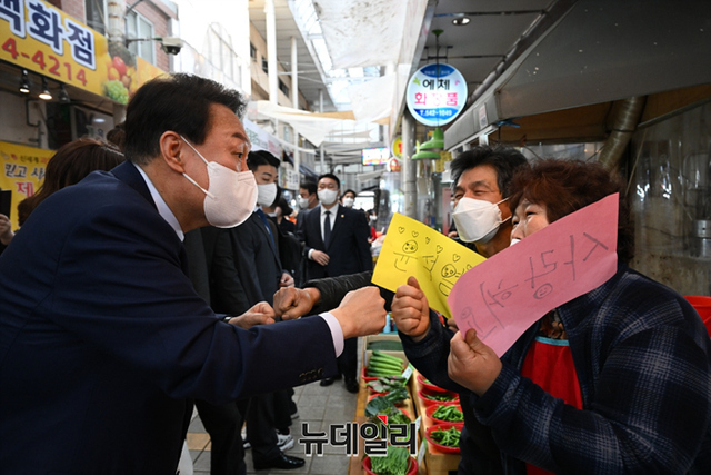 윤석열 대통령 당선인이 22일 오전 부산 해운대구 반송큰시장에서 시민들과 인사를 나누고 있다. (사진=인수위)