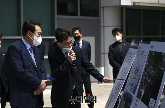 윤석열 대통령 당선인이 22일 오전 부산 해운대구 반여농산물시장역을 찾아 센텀2지구 도시첨단산업단지 현장을 살펴보고 있다. (사진=인수위)