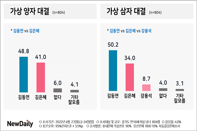 여론조사업체 피플네트웍스리서치(PNR)가 뉴데일리 의뢰로 지난 23~24일 이틀간 경기도 거주 만 18세 이상 남녀 804명을 대상으로 차기 경기지사 가상 양자대결을 붙인 결과 김동연 후보는 48.8% 김은혜 후보는 41.0%로 조사됐다.