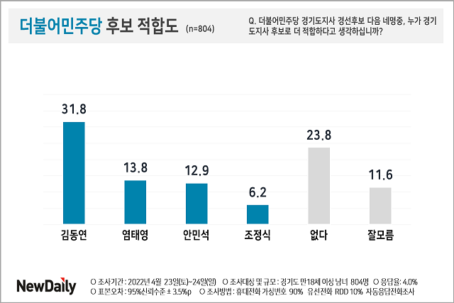이번 조사에서 민주당 후보 적합도를 물은 결과 김동연 후보는 31.8%로, 염태영(13.8%), 안민석(12.9%), 조정식(6.2%) 후보를 오차범위 밖에서 앞섰다. 다만 '없다'는 응답은 23.8%, '잘모름'은 11.6%로 나타나 아직 후보를 결정하지 않은 응답자가 많은 것으로 나타났다. 이들이 경선에서 변수가 될 가능성을 배제할 수 없다.