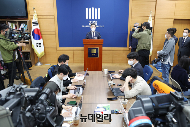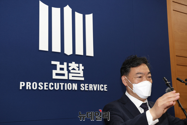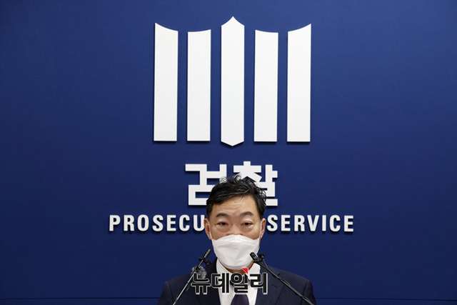 김오수 검찰총장이 여야가 합의한 '검수완박(검찰 수사권 완전 박탈)' 중재안과 관련해 25일 오전 서울 서초구 대검찰청에서 기자회견을 열고 발언하고 있다.