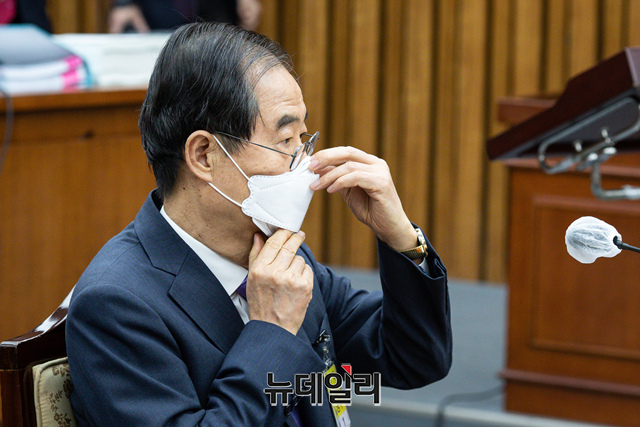 한덕수 국무총리 후보자가 25일 오전 국회에서 열린 인사청문특별위원회에 참석해 안경을 고쳐쓰고 있다. (사진=공동취재단)