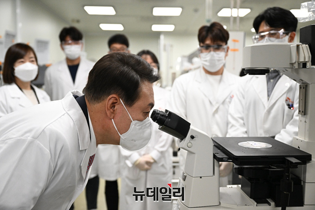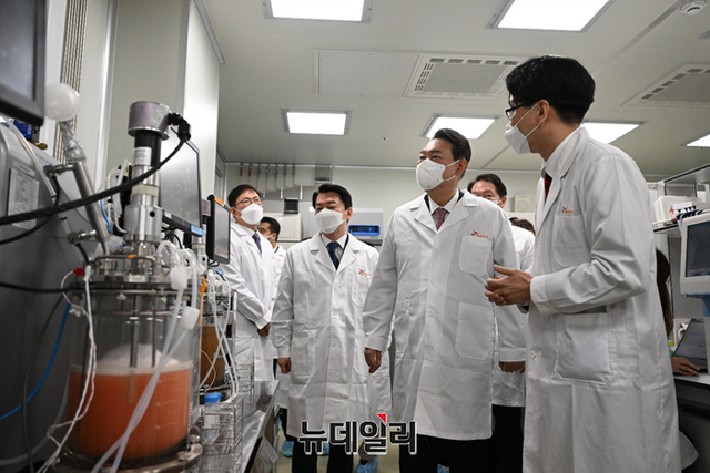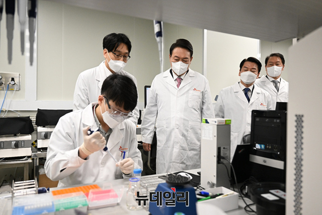 윤석열 대통령 당선인이 25일 오전 경기 성남시 분당구 SK바이오사이언스를 찾아 국내 1호 코로나19 백신 개발 현장을 살펴보고 있다. (사진=인수위)