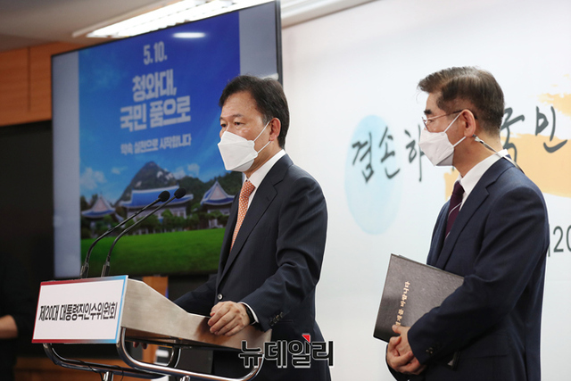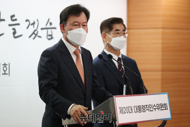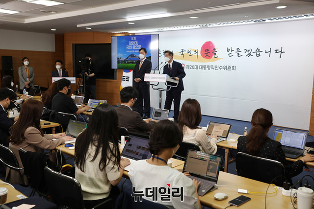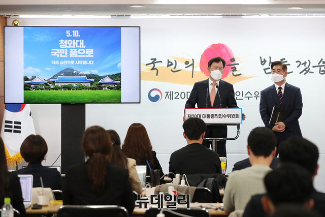 윤한홍 청와대이전태스크포스(TF) 팀장이 25일 서울 종로구 통의동 대통령직인수위원회 공동기자회견장에서 청와대 개방 행사 관련 발표를 하고 있다. (사진=인수위)