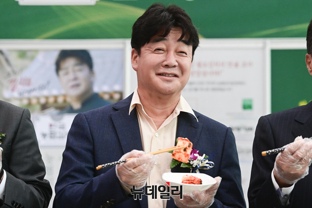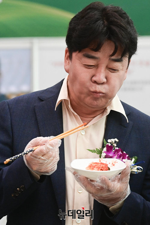 백종원 더원코리아 대표가 25일 오전 서울 중구 농협중앙회에서 열린 '한국농협김치조합공동사업법인' 출범식에서 농협김치를 시식하고 있다.