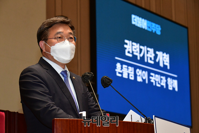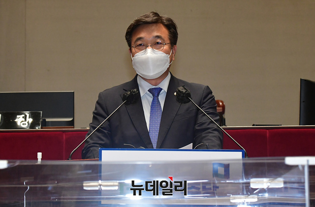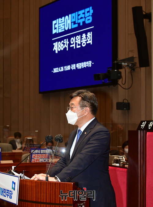 윤호중 더불어민주당 공동비상대책위원장이 26일 오후 국회에서 열린 의원총회에서 모두발언을 하고 있다.