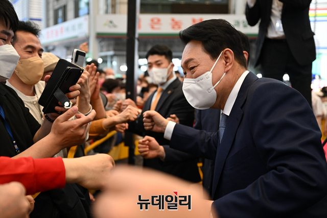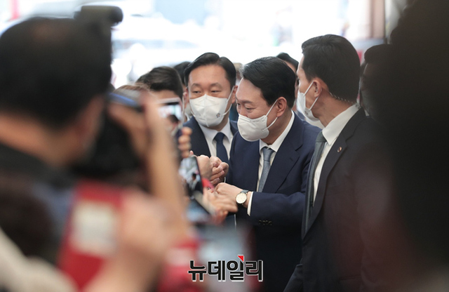 윤석열 대통령 당선인이 26일 인천 계양산전통시장을 방문해 시민들과 인사를 나누고 있다. (사진=인수위)