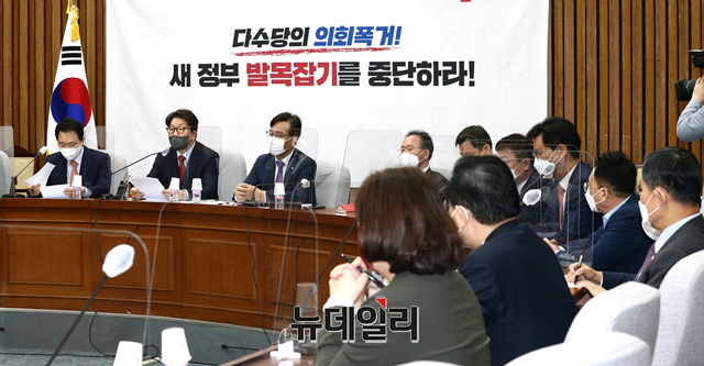 권성동 국민의힘 원내대표가 27일 오전 국회에서 열린 국민의힘 상임위원장 및 간사단 연석회의에 참석해 발언하고 있다.