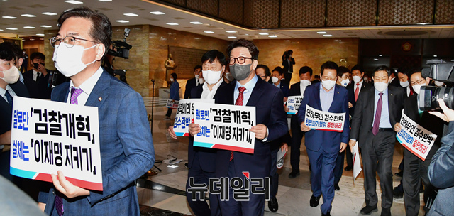 [포토] 검수완박 반대 피켓 들고 본회의장 향하는 국민의힘 의원들
