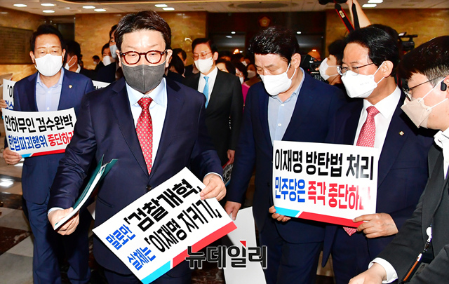 검수완박 반대 피켓을 든 권성동 국민의힘 원내대표와 소속 의원들이 27일 오후 국회 본회의장으로 입장하고 있다.