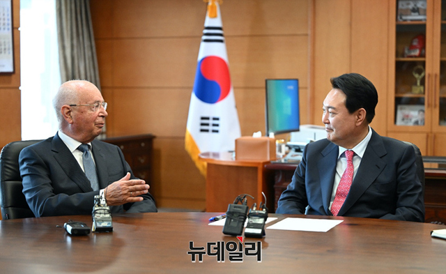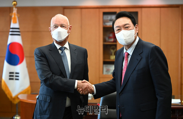 윤석열 대통령 당선인이 27일 오후 서울 종로구 대통령직인수위원회 집무실에서 클라우스 슈밥 세계경제포럼 회장을 만나 악수를 나누고 있다. (사진=인수위)