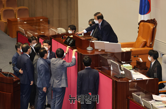[포토] 박병석 의장에게 항의하는 여야 의원들